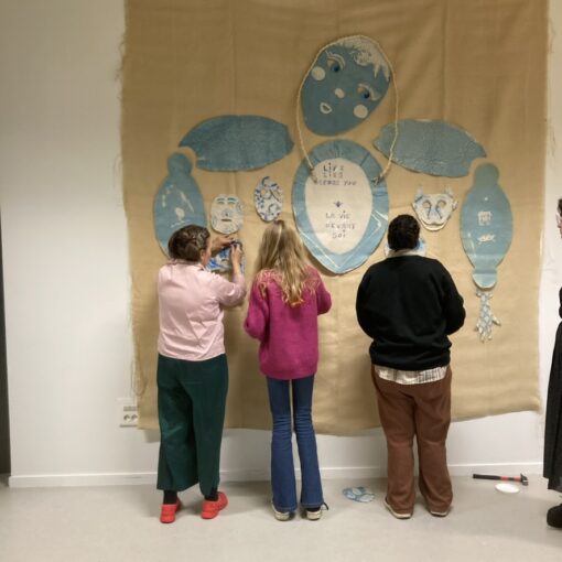 Dans le cadre de l’eroa de l’établissement, deux classes de cinquième ont pu rencontrer Damien Gete et découvrir son travail en avant-première. Après une visite de l’exposition et une introduction sur la démarche qui l’a amené à ses œuvres, l’artiste a initié des ateliers de pratique reprenant les techniques de fabrication de certaines parties de ses œuvres. Par des moulages de terre et de plâtre, les élèves ont pu laisser la trace de leurs corps en réalisant des sculptures. Les travaux des élèves ont ensuite été installés in situ avec et par la main de l’artiste, comme partie prenante de l’exposition.