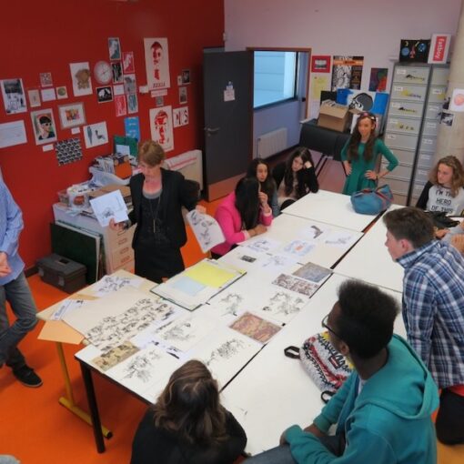 Je propose de travailler sur une installation avec les élèves où on pourra expérimenter comment placer et combiner les œuvres, comment cela influence et change le travail en fonction de ce qui est proche et comment cela est montré.