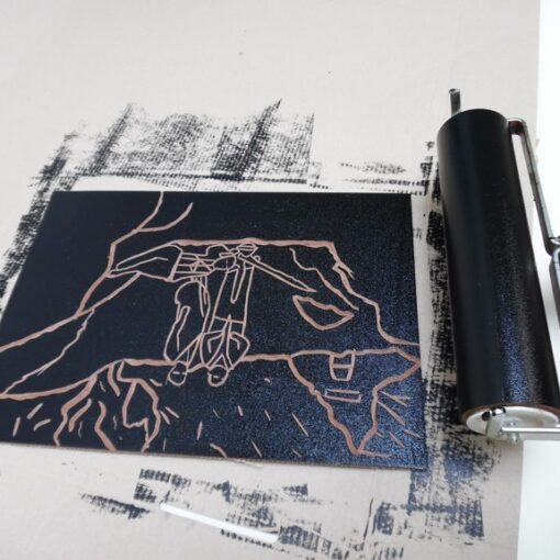 - une série de masques-heaumes d’animaux fabriqués par les élèves de 6e exposés en deux ronds, le tout à même le sol et éclairés par deux lampes projetant les ombres de ces masques sur les murs ;