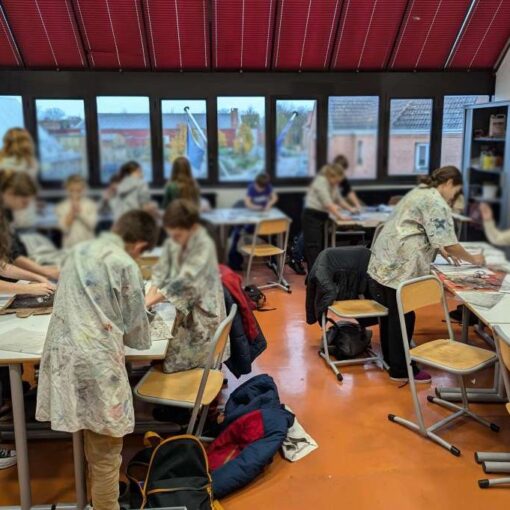 Les visites s’enchaînent devant les œuvres prêtées par le Musée du dessin et de l’estampe originale de Gravelines et par Guillaume Lepoix et Thomas Daveluy. Cette semaine, les classes de 6e vivent une parenthèse enchantée dans la salle d’exposition avec la conteuse Christine Charpentier : une découverte des œuvres par le biais des contes, qui les invite à repenser leurs liens avec la nature, les arbres tout en devenant des consommacteur.