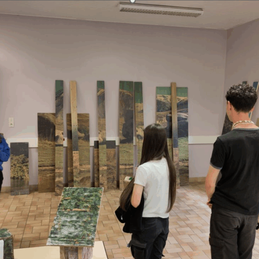 Après une visite des œuvres personnelles installées en salle EROA, les élèves ont pu découvrir un extrait de la performance musicale de Gauthier Leroy avec le diddley-bow. Les élèves ont apprécié pouvoir s’essayer à cet instrument et faire quelque chose de sympa très rapidement. Une seule corde, micro magnétique, emplacement des frettes de deux couleurs pour différencier l’échelle diatonique, et repères spécifiques pour la gamme pentatonique mineure et les blue notes.