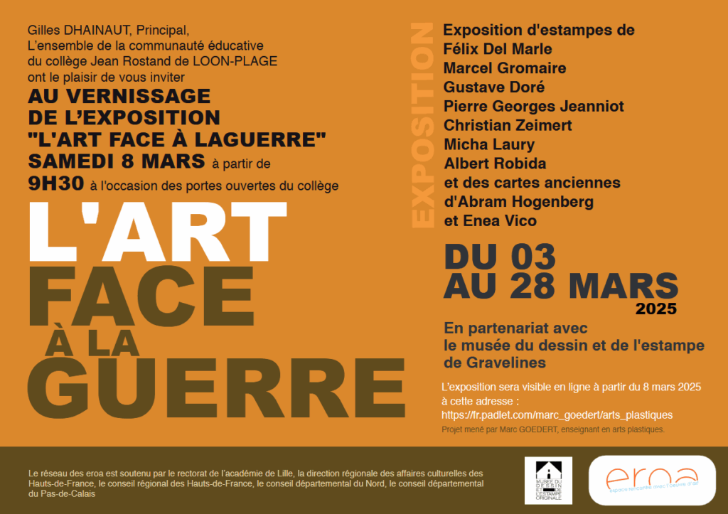 Pour ce 6ème EROA du Collège Jean Rostand nous avons renouvelé un partenariat avec le Musée de l’estampe et du dessin originale de Gravelines avec une nouvelle thématique qui a porté sur les rapports entre l’art, les conflits et la façon de les représenter. Par conflit on entend : une lutte armée, un combat entre deux ou plusieurs puissances qui se disputent un droit (un conflit mondial par exemple). Les synonymes étant : bataille, guerre, hostilités, lutte. La problématique a été la suivante : l’art peut-il représenter l’indicible ? Et comment représenter la guerre ? Quelle place peut occuper un artiste face au conflit ?