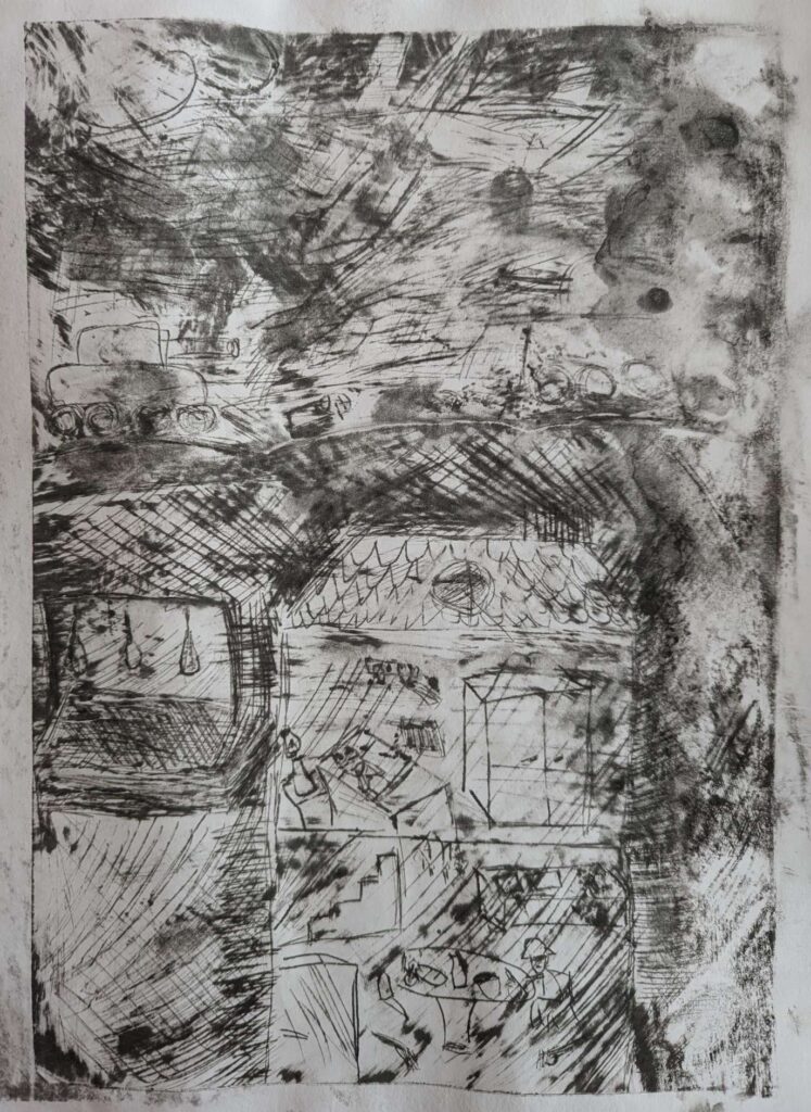 4ème : La guerre sous différents angles. Après avoir observé les différents genres dans la peinture académique les élèves devaient représenter leur propre vision de la guerre (par une technique graphique ou picturale puis en utilisant la gravure). Au lieu de représenter uniquement des champs de bataille certains ont ainsi préféré représenter des scènes de la vie du quotidien, des portraits ou des paysages. Cette liberté a permis de développer chez eux un certains esprit critique. Une réflexion nourrie par des textes observées en cours de français et d’histoire géographie. Ils devaient clarifier leurs intentions et analyser les effets obtenus via la technique de la gravure.