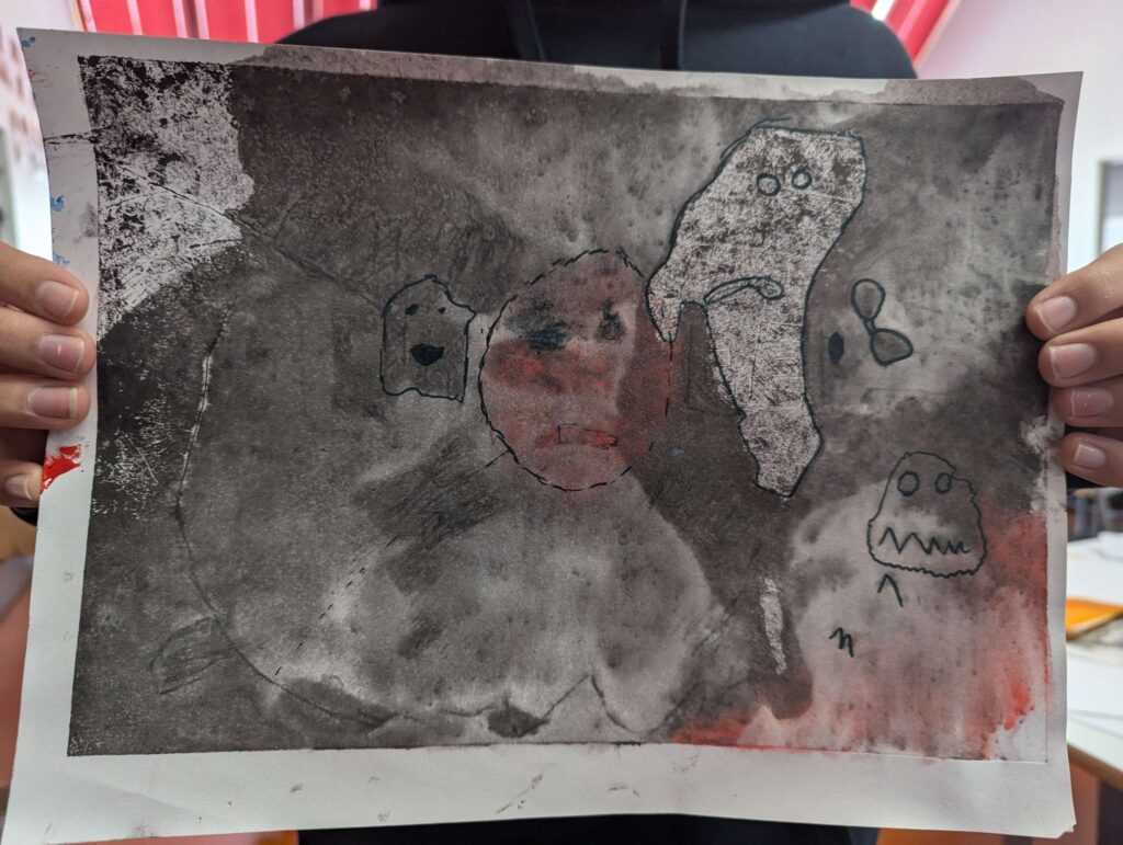 5ème : les élèves devaient représenter un portrait monstrueux de la guerre à travers une technique graphique ou picturale puis en poursuivant leur démarche avec la technique de la gravure. Ce travail est rentré en résonance avec les