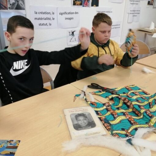 Les élèves de 5è curie ont débuté les travaux plastiques tout en réinterrogeant la peinture abstraite et en intégrant des broderies à une recherche plus formelle.  Ce  travail plastique mené par les élèves a un ancrage local mais fait écho, entre autre, à Matisse, Kandinsky ou Myriam Shapiro.